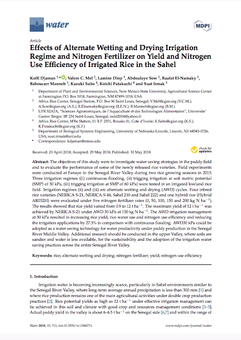 Header photo: A field day at the AfricaRice-Sahel Regional Station in Saint Louis Senegal. Senegal is one of the sub-Sahara African countries to benefit from the alternate wetting and drying (AWD) method of irrigation. Photo by R. Raman/AfricaRice.