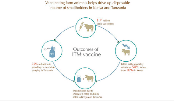 There have been additional income benefits for distributors and vaccinators who provide the ITM vaccine, and for the current manufacturers of the vaccine based at the Centre for Ticks and Tick-Borne Diseases, Malawi.