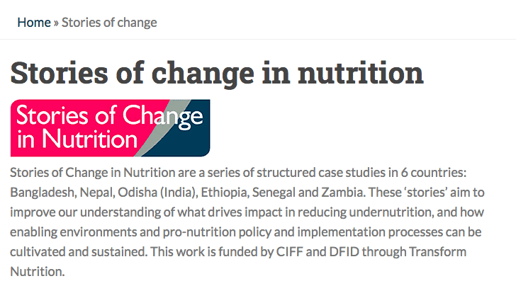 Drawing initially upon six case studies of countries or territories that had experienced significant success in driving down rates of child stunting – Bangladesh, Nepal, the state of Odisha in India, Ethiopia, Senegal, and Zambia – Stories of Change has since shed light on the drivers and pathways of nutrition-relevant change, with a particular focus on the determinants of political commitment, policy and program coherence, and effective implementation of nutrition-relevant actions.