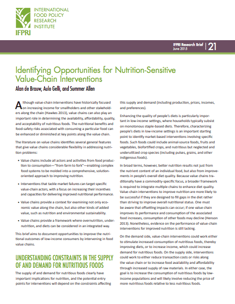 The innovative framework has gained traction across a number of implementing and funding agencies keen to design and implement successful nutrition-sensitive value chain projects. For example, the framework was adapted by the Working Group on Sustainable Food Value Chains for Nutrition of the Rome-based agencies of the United Nations, which brought together the Food and Agriculture Organization (FAO), International Fund for Agricultural Development (IFAD), World Food Programme (WFP) and Alliance of Bioversity International and CIAT, with contributions from IFPRI.